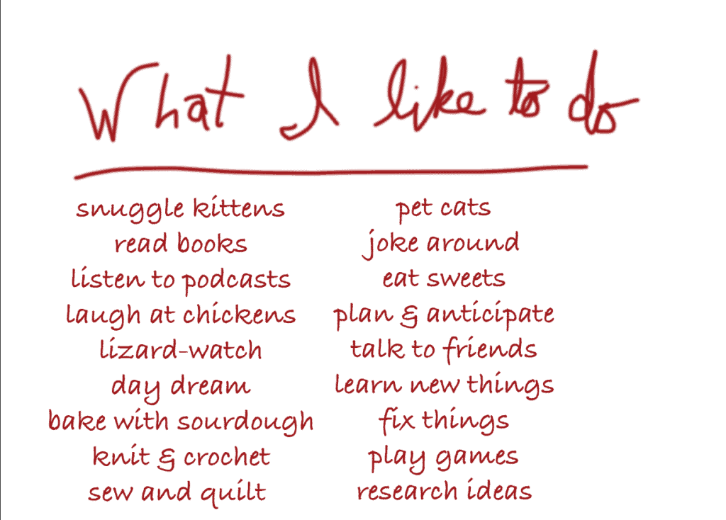 I made this list while holding a cat who was demanding attention, (he clearly doesn’t think I do enough petting); maybe, for honesty’s sake, it should read HOLDING cats, not petting them. I also forgot to include listmaking, but maybe that can go under either plan or daydream.