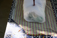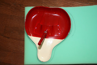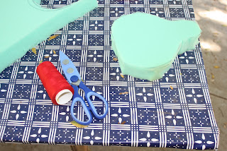 i laid the seat (with its foam and batting) on my fabric, and roughly cut the shape of the trike seat. (i took a rectangle and cut 2 corners off, so it was a very oddly shaped hexagon)