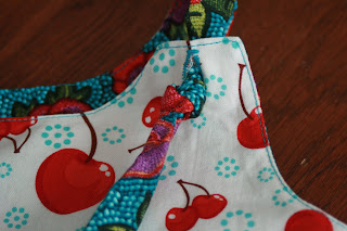 i decided to try this out, i’ve seen bibs made like this. basically, you just tie a knot where you want a button, so you can easily lengthen or shorten straps, as a kid grows. so i thought it might be cool on this dress/top. plus it makes it more easily reversible with no buttons on the inside, for comfort.