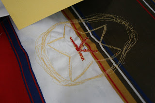 I free-motion zigzagged the K first, then lightly sketched the star (with water soluble marker), so the points would be roughly even, and straightstitched those… then I just went around and around and around the K/Star to make it slightly more badge-like.
