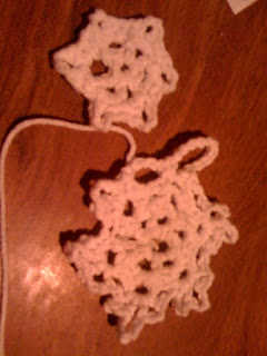 My prettier snowflakes have already been gifted (to Gram) or stolen (by D), but here’s my version… I’m using cotton, instead of wool (because that’s the only white I have on hand, and since I’m JUST getting back into it, after a 10 year hiatus, I don’t want to practice on expensive new stuff). It doesn’t block as nicely, (although, these haven’t been blocked AT ALL, which is why the look icky), but it’s free, so….