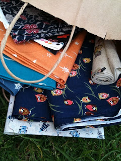 I bought several fat quarters (only $2 each!) and several regular quarters, and 1 yd of the owl print, planning on making one side of D’s sunhat from that, but then he wanted trains…