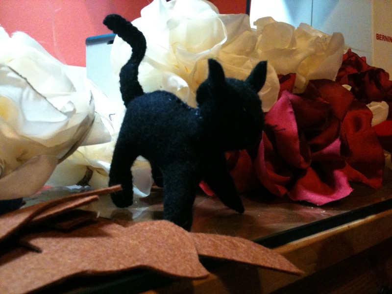 now do you see him? this is the felt version of Kieran, the darkest kitty ever. I’d photograph him more, but he’s very very dark, and always very sleepy, so all you’d see is a dark blob… (the brown bits lower left are going to be Guinness (our dog, not the beer), hopefully tomorrow night…)
