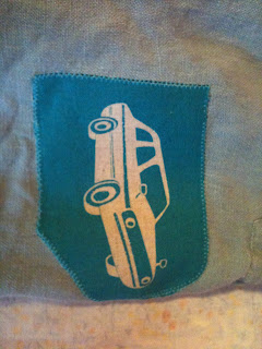 So I quickly cut out a car from this cotton-linen blend Echino print, interfaced the back of it (for stability), and blanket stitched the patch centered over the holes.