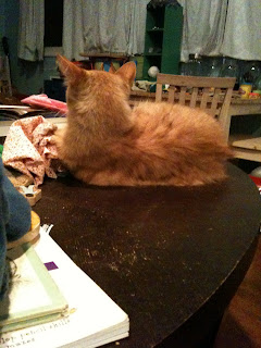 I won't let him sit on my lap, because I'm knitting, so he's on the coffee table, as far from me as his fluffy orange butt can get, despite the fact that he's crowded by books and trains.