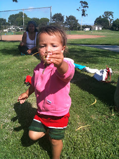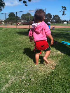 K, so the first longies were in size 18-24, and they were too big, but with a drawstring waist, and a big cloth diaper, they'll stay up. Then I made a pair of 12-18 sized shorties, equally too big. So here's pair #3, sized 6-12 month, over a cloth diaper, and they fit my 22month old PERFECTLY. I'm sooooo pleased with the finished product!