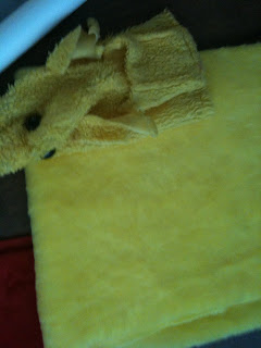 so, I borrowed the rather despondant puppet, some tracing paper, fleece (for practicing), and some new, lush, faux fur in a VERY bright primary yellow. (I couldn’t find red faux fur, so the red puppet is going to be a very soft minkee)
