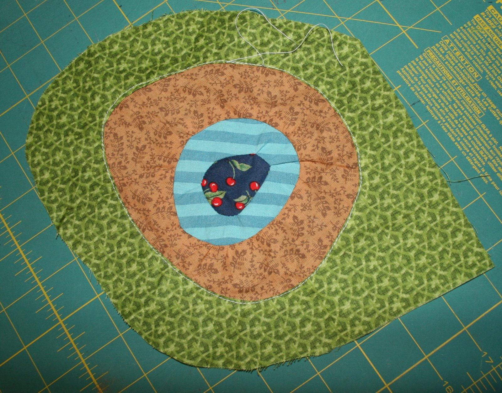 I used the 6-minute circle technique (Thanks to Latifah for teaching our guild about it!) for the inner 3, but the outer circle was just appliqued, and I like both….
