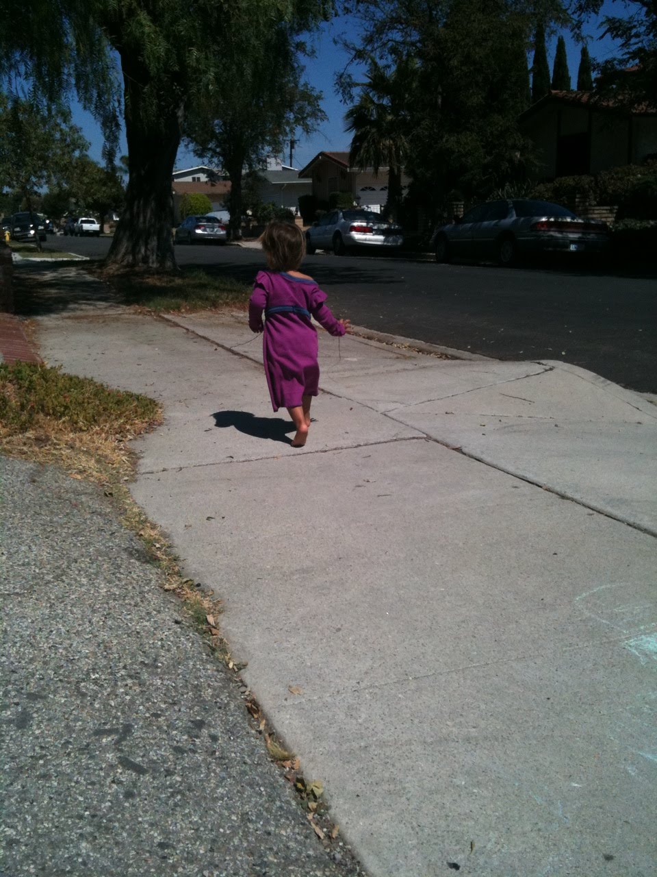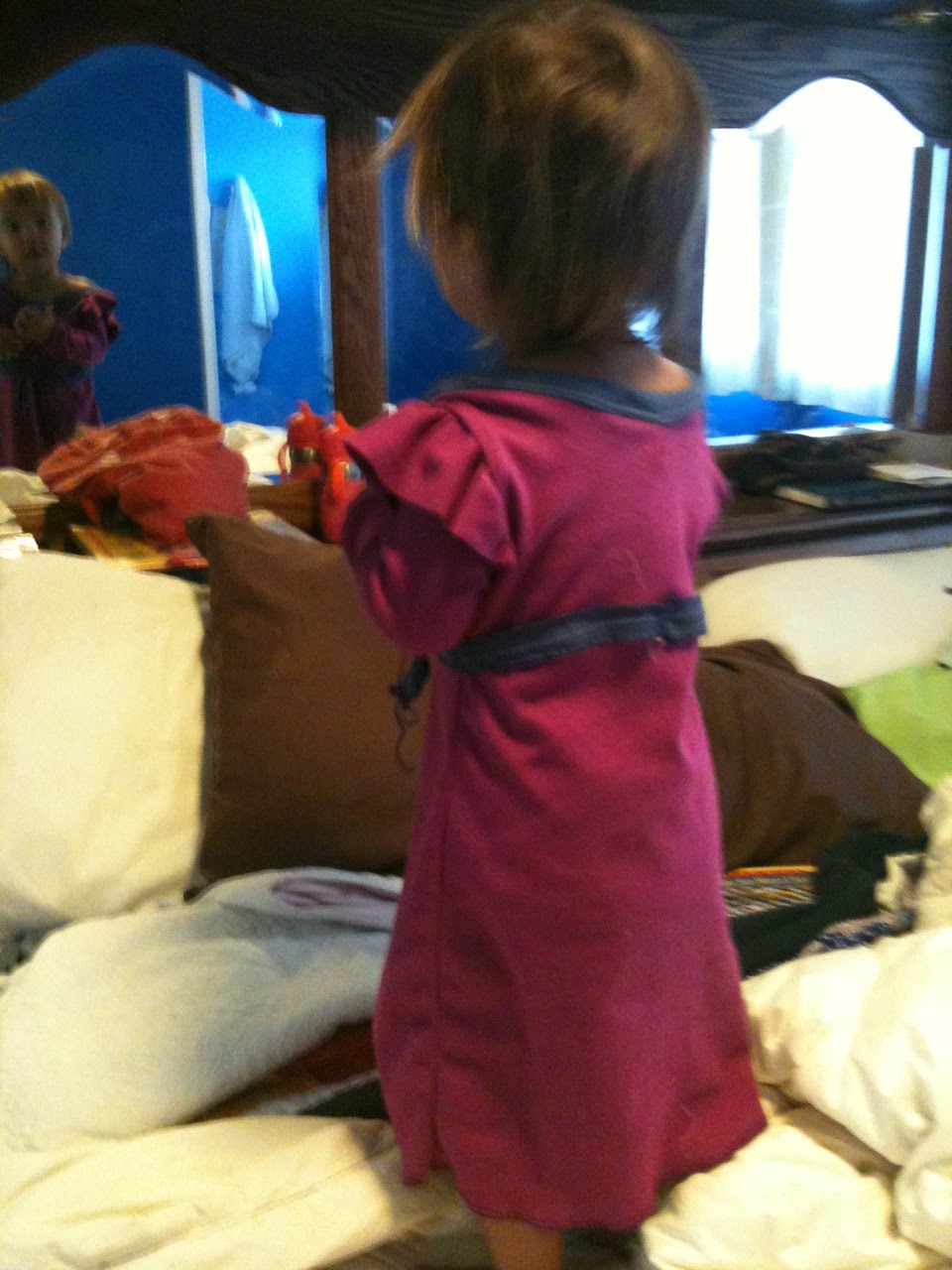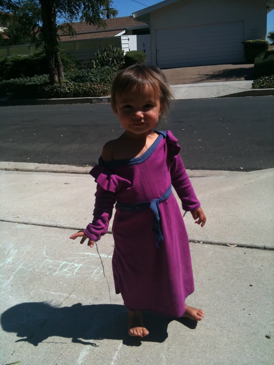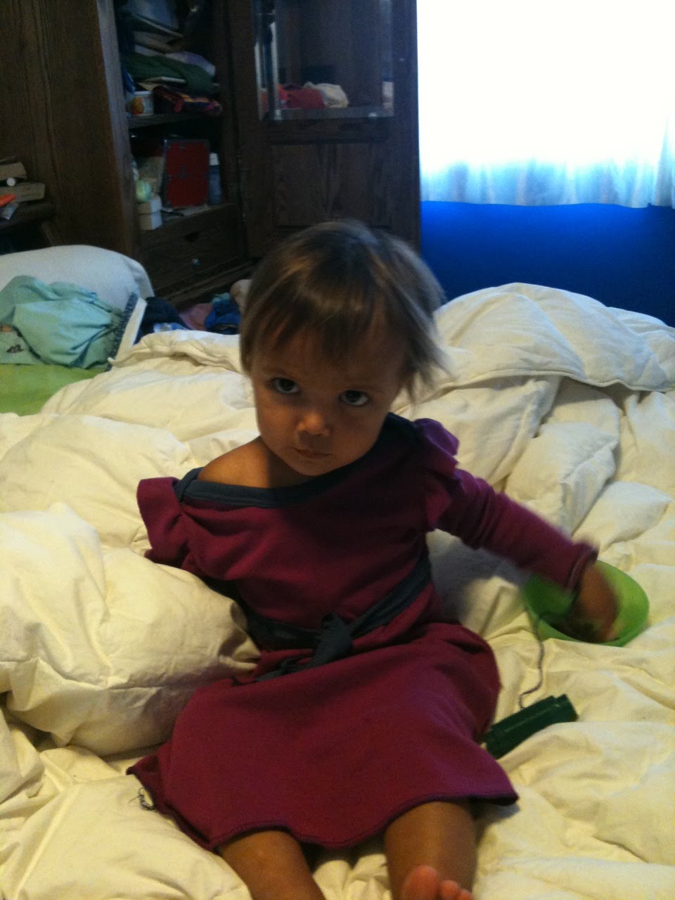 The bean really likes my new dress idea, even though I haven't clipped threads, and despite the fact that it turned out HUGE on her. Also, I accidentally sewed one sleeve on inside out. That what happens when you sew with an almost-2-year-old on your lap, "helping."