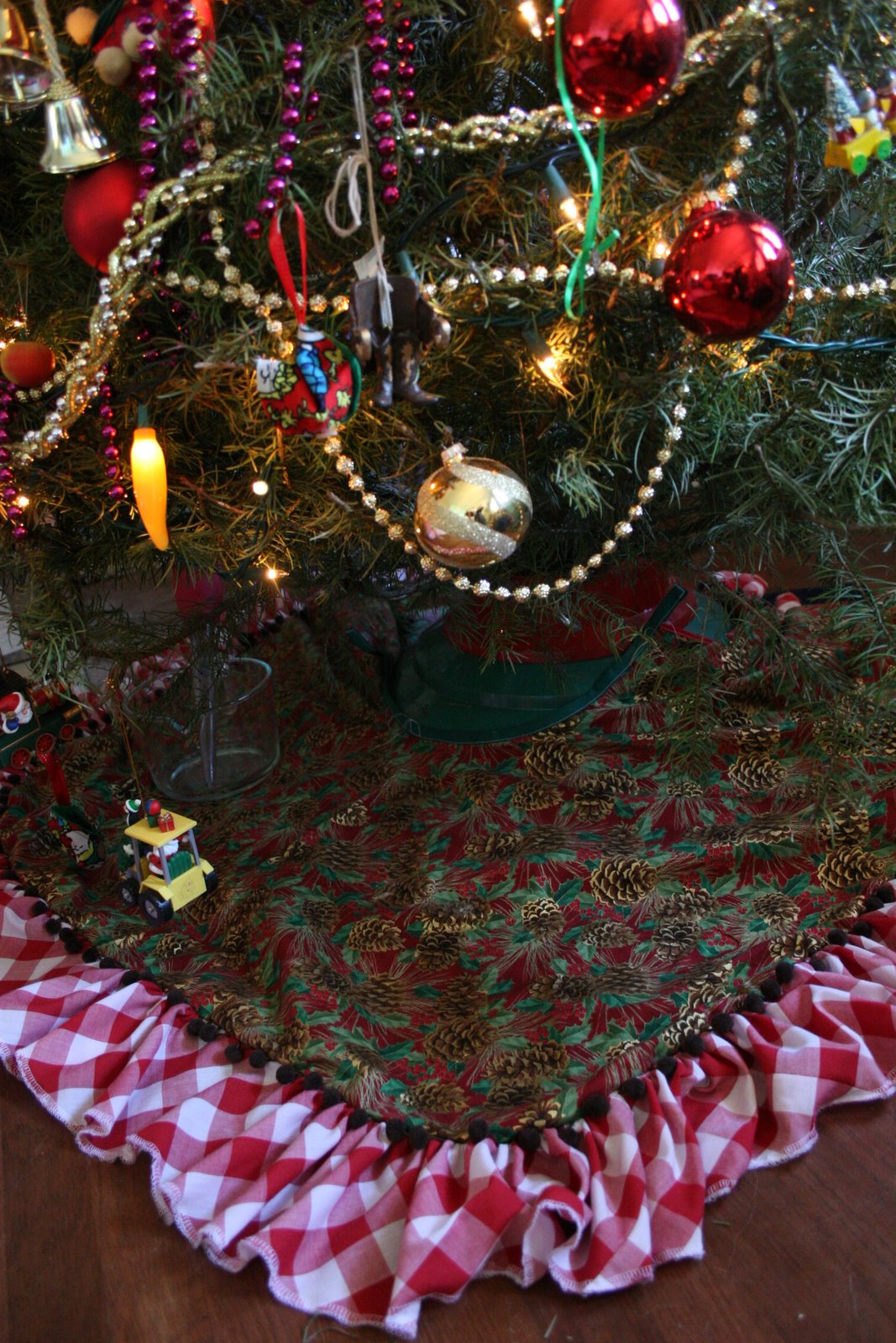 a tree skirt (the Bean really liked this sparkly pinecone fabric, and I couldn’t think of what else to do with it… we needed a treeskirt anyway… no. we didn’t. but we didn’t HAVE a tree skirt, so while being unneccessary in reality, it was a fun project…)