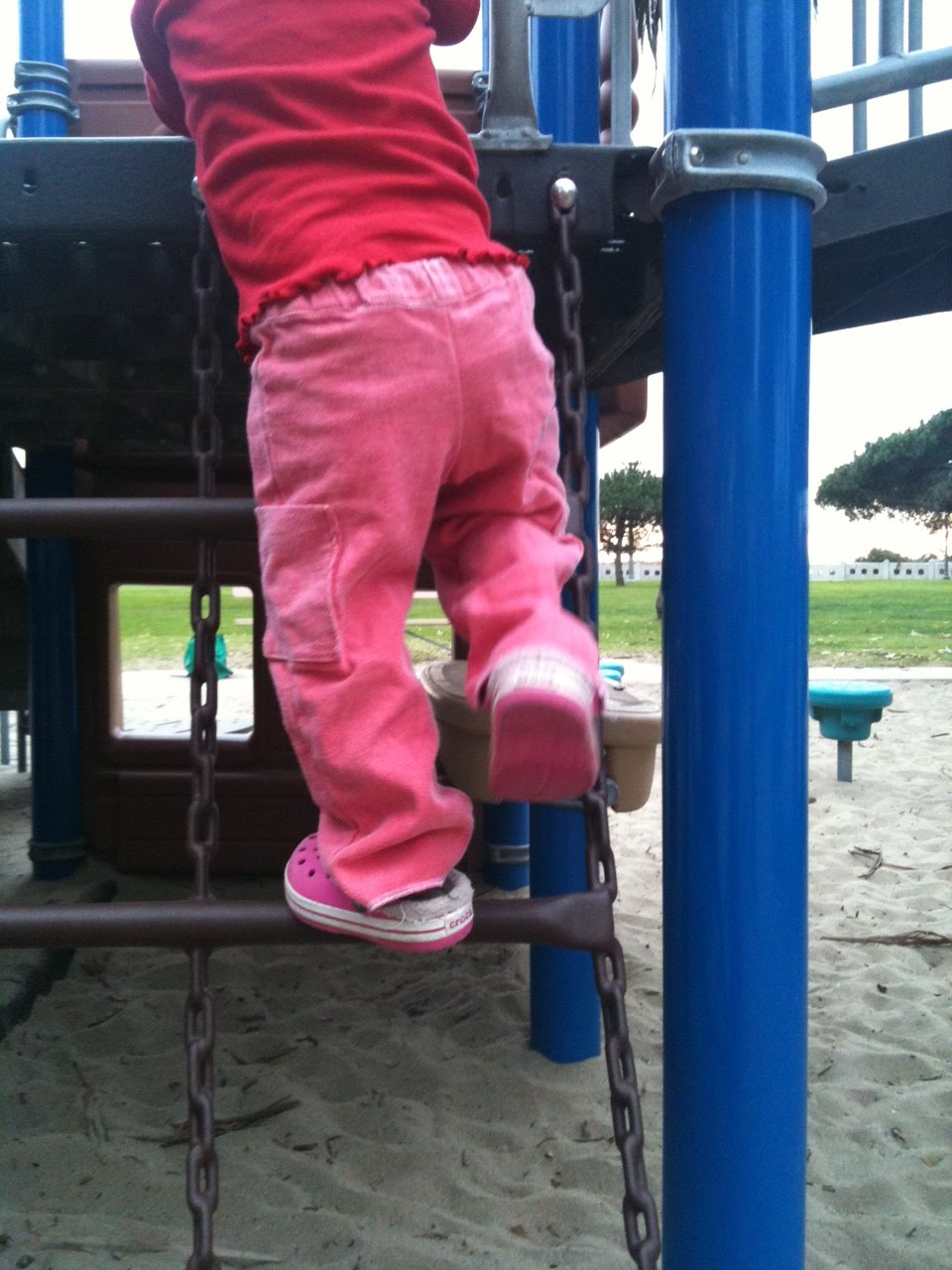 Or Grandma's pants, recycled. My gram unearthed an old (bellbottom) pair of pants in this awesome Salmon Pink denim. So I cut them up and made the Bean a pair of pants. She loves the cargo pockets, and the color, and I love the sturdy denim (and free price).