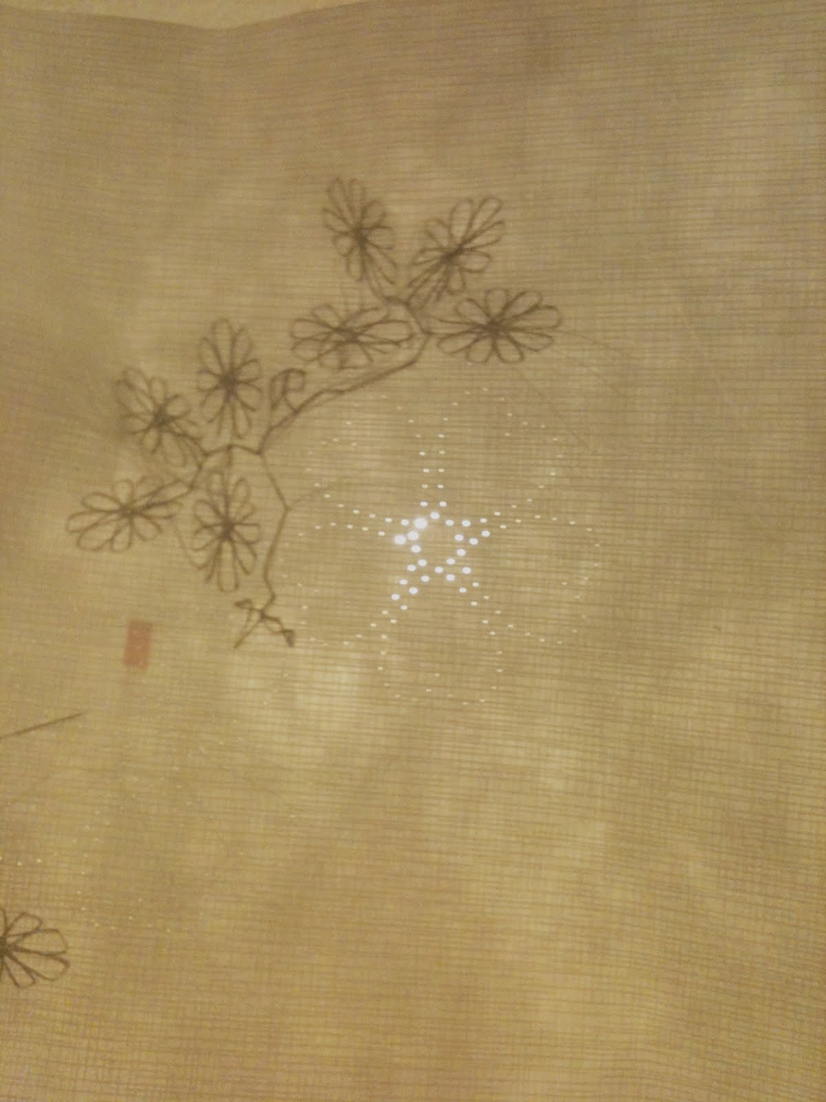 Or maybe it's called string art even if it's lacking nails and is done with a needle? I've punched all the holes in the Tyvek, and gotten the leaves/stems done, so I'll work on the flowers tomorrow… I also need to research how to iron/smooth Tyvek. There are major creases in it from mailing….