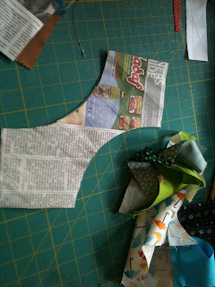 anyway, after you sew enough strips to cover the newspaper, press, flip, and use the newspaper as a template and cut it out.