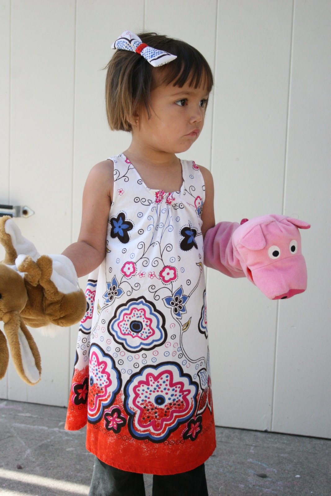 I actually had enough of the skirt to make TWO (mostly) identical dresses (each with a bow). and since I don’t remember who gave me the skirt originally, I’ll be sending one of these off to my friend Emily, for her little girl.