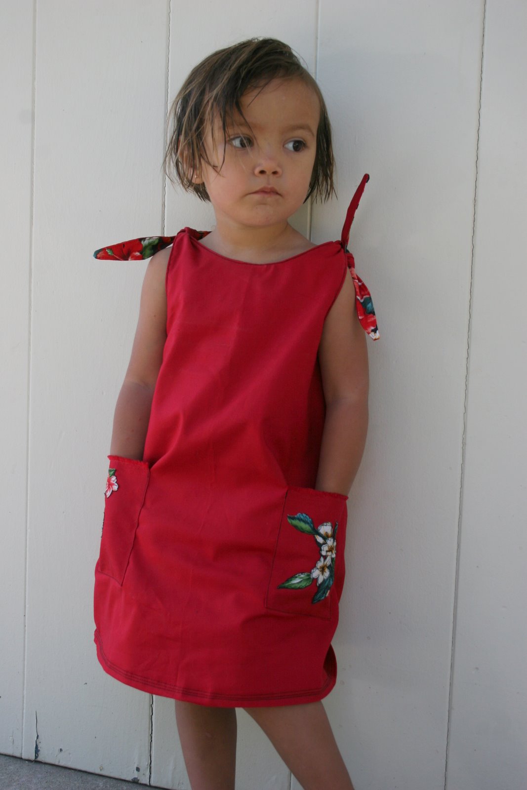 to break up the plain solid red, I appliqued the pockets with flowers cut from the hawaiian print scraps.