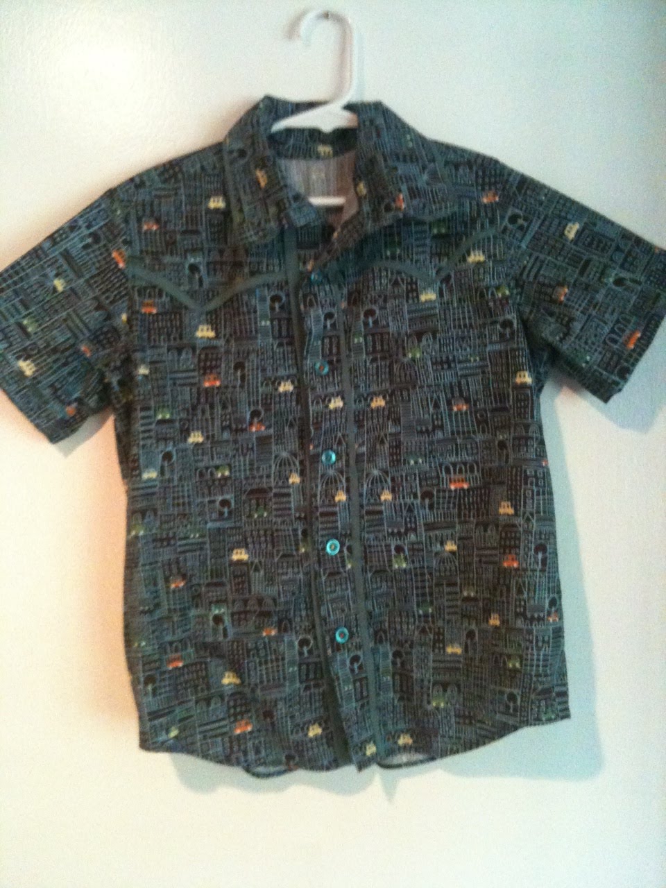 Fabric is Honk-Honk (brown) by Michael Miller, trim is a blue/brown shot cotton, pattern is my own.