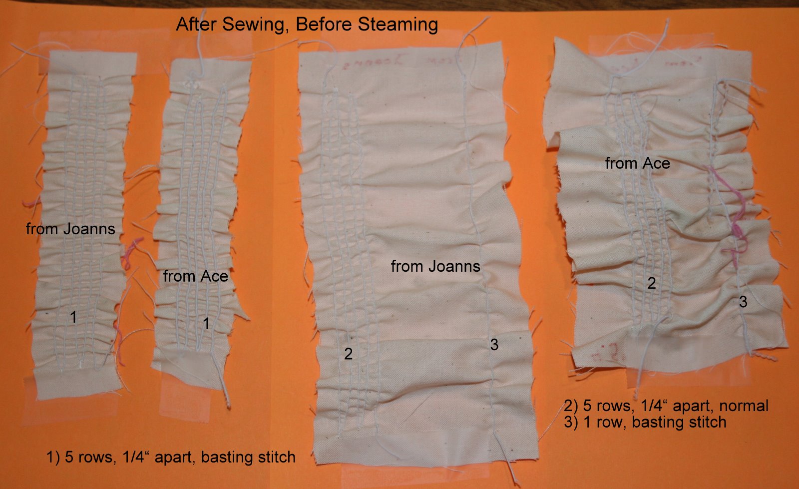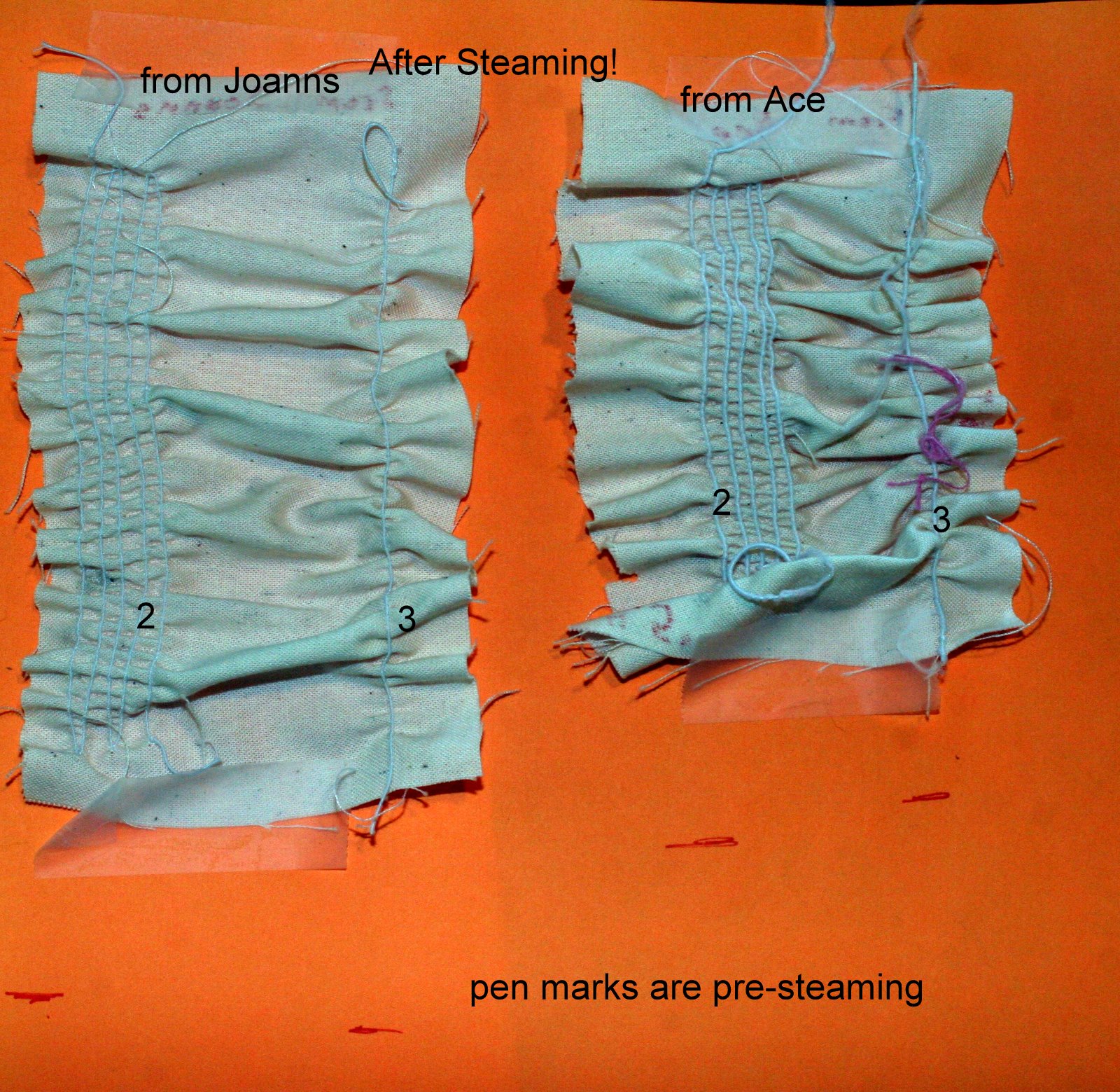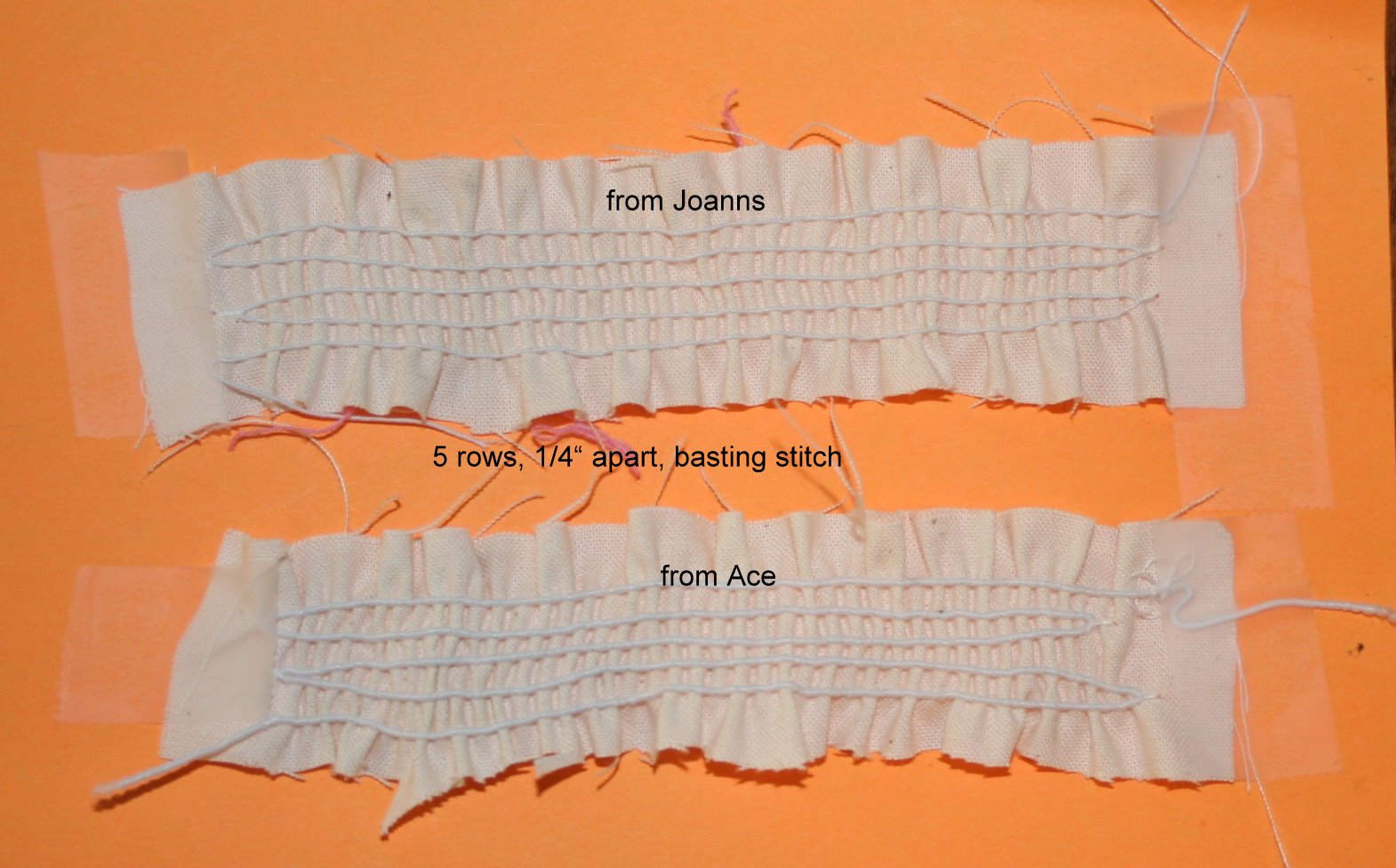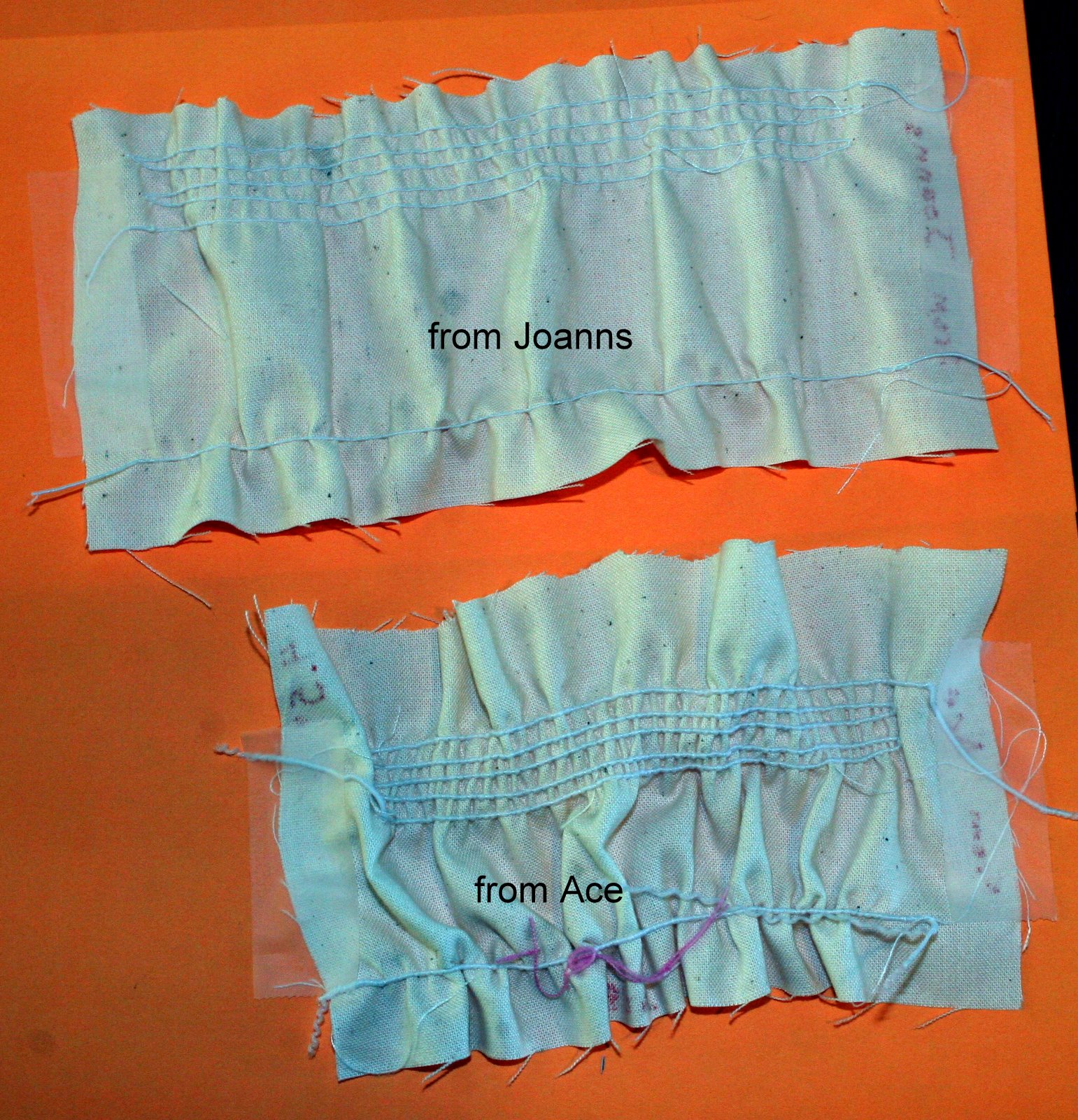 I’ve been have been really unhappy with my elastic shirring lately. I’ve been doing everything the same way I always have, but getting saggy results. I noticed that my elastic thread (dritz brand, maybe? whatever they sell at my Joanns) is skinnier than it used to be… and then I was downtown a few weeks ago, and I bought this HUGE cone of it (no name brand, but the store was called ACE Sewing, and the people were really nice). So D and I conducted an experiment to test the difference. (Click the pictures to see them bigger)