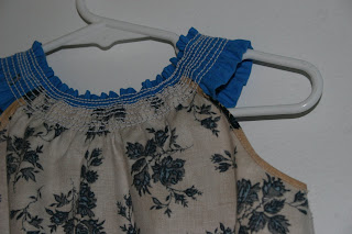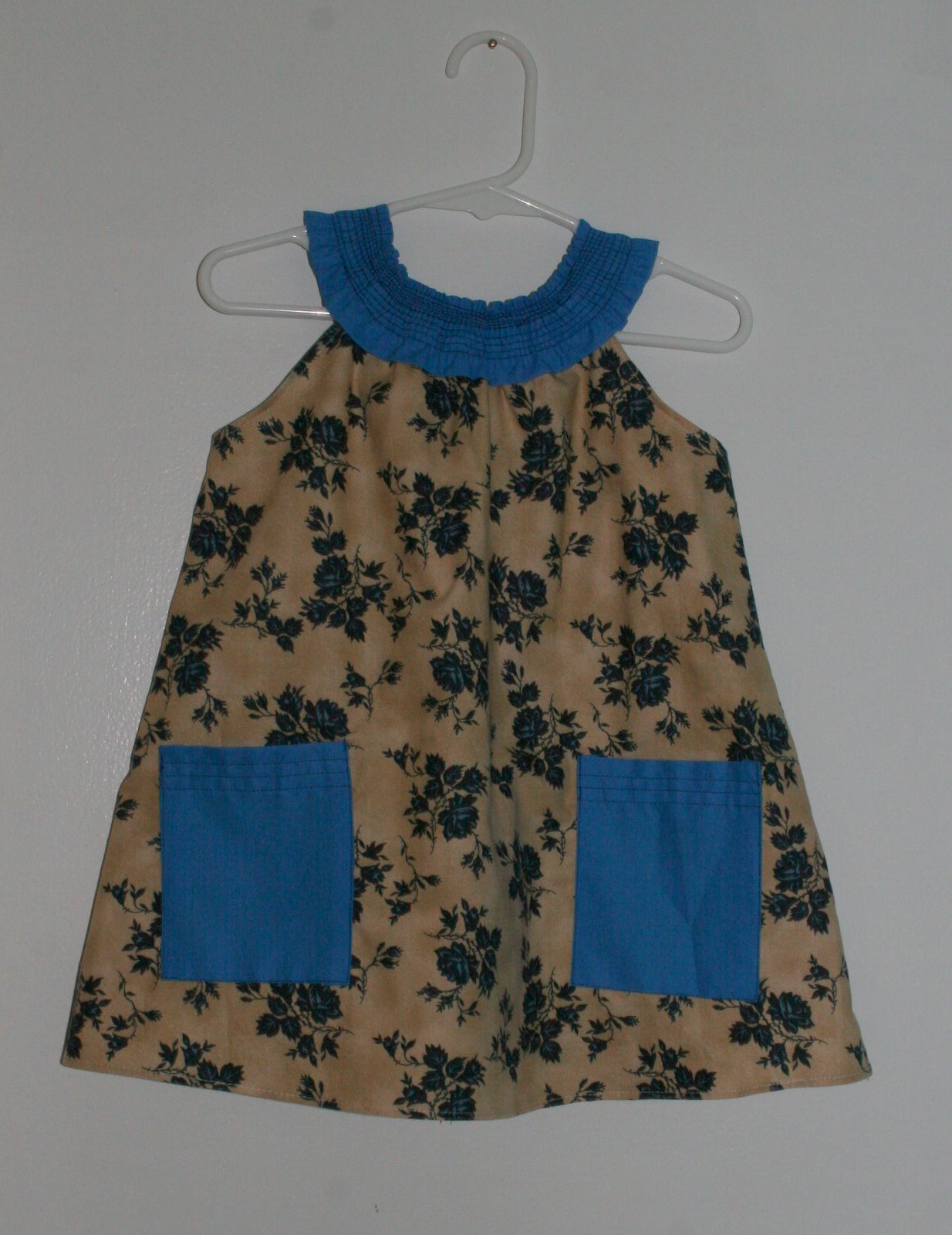 I’ve seen (and made) similar styles with knits quite often, but rarely have I seen it done with quilting cotton. So I’m quite pleased with this, and especially the lack of itchy parts… I was able to finish or encase all the raw edges, so the Bean thinks it’s quite comfortable, and actually wants to wear it, despite its color. (She likes blue, but the floral background is a mottled beige color….)