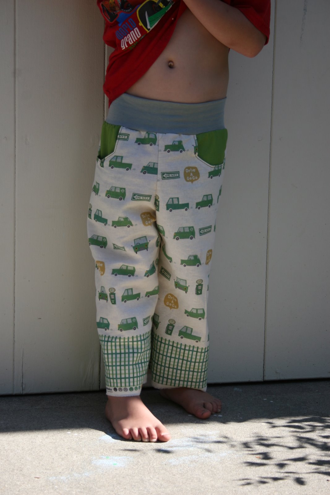 (The trick to awesome pants like this is awesome fabric, which unfortunately costs a bundle. But it was on sale at momen + for 1/2 off, so it was only $10/yd, I only needed 3/4 of a yard, it was in D’s favorite color, and it was my birthday. So now he has cute Mama’s-birthday-pants.)