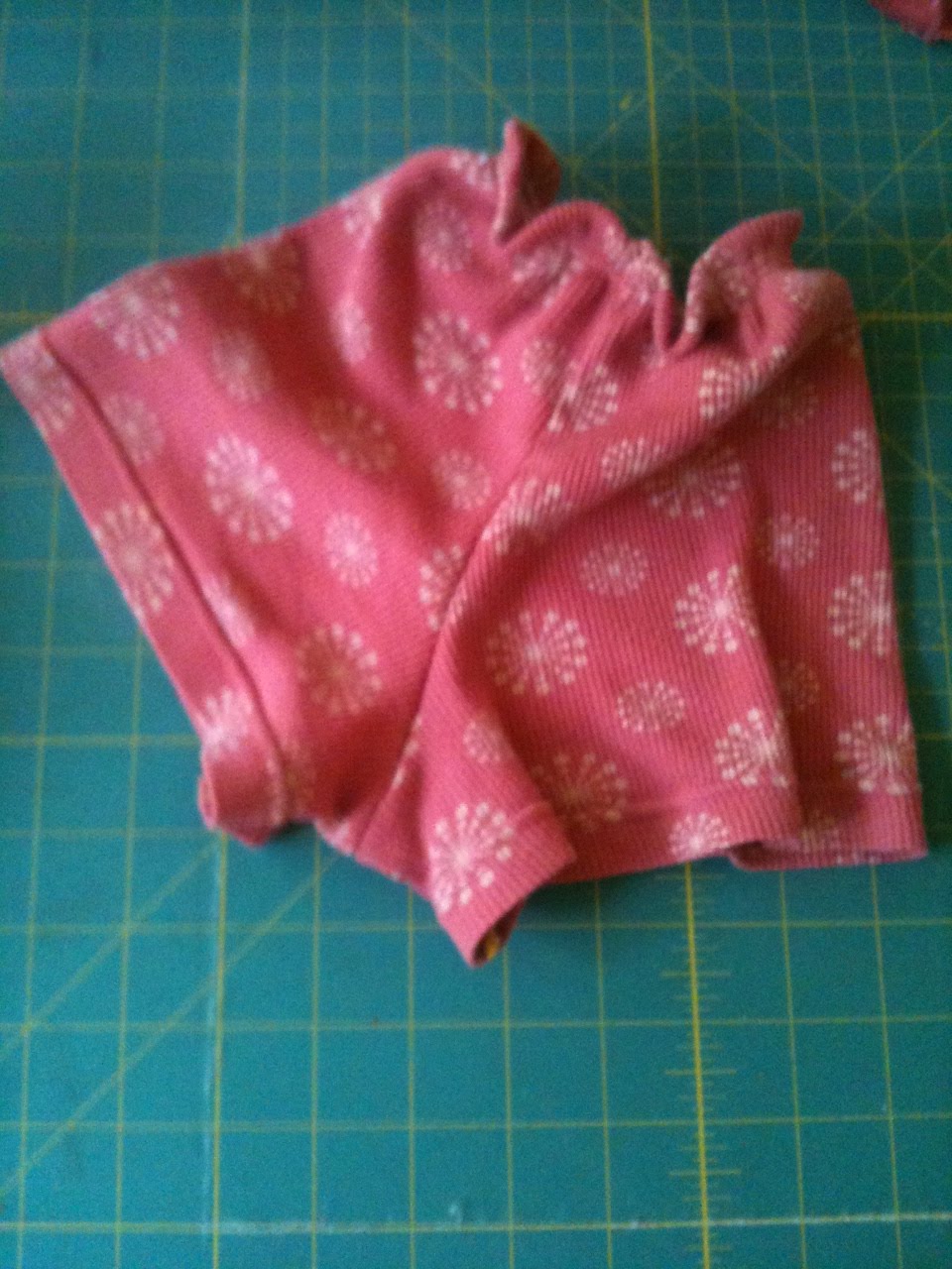 Turn right side out. Fold over the top, to the inside, and use elastic thread to shir through the fold, gathering the waist. I went around 2.5 times, and then my bobbin was empty, and the Bean didn’t want to wait for me to wind a new bobbin. So these aren’t tooooo shirred, but they’re shirred enough to stay up.