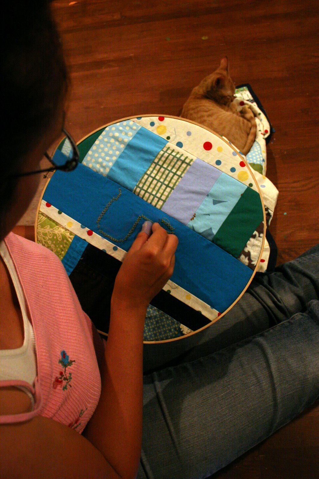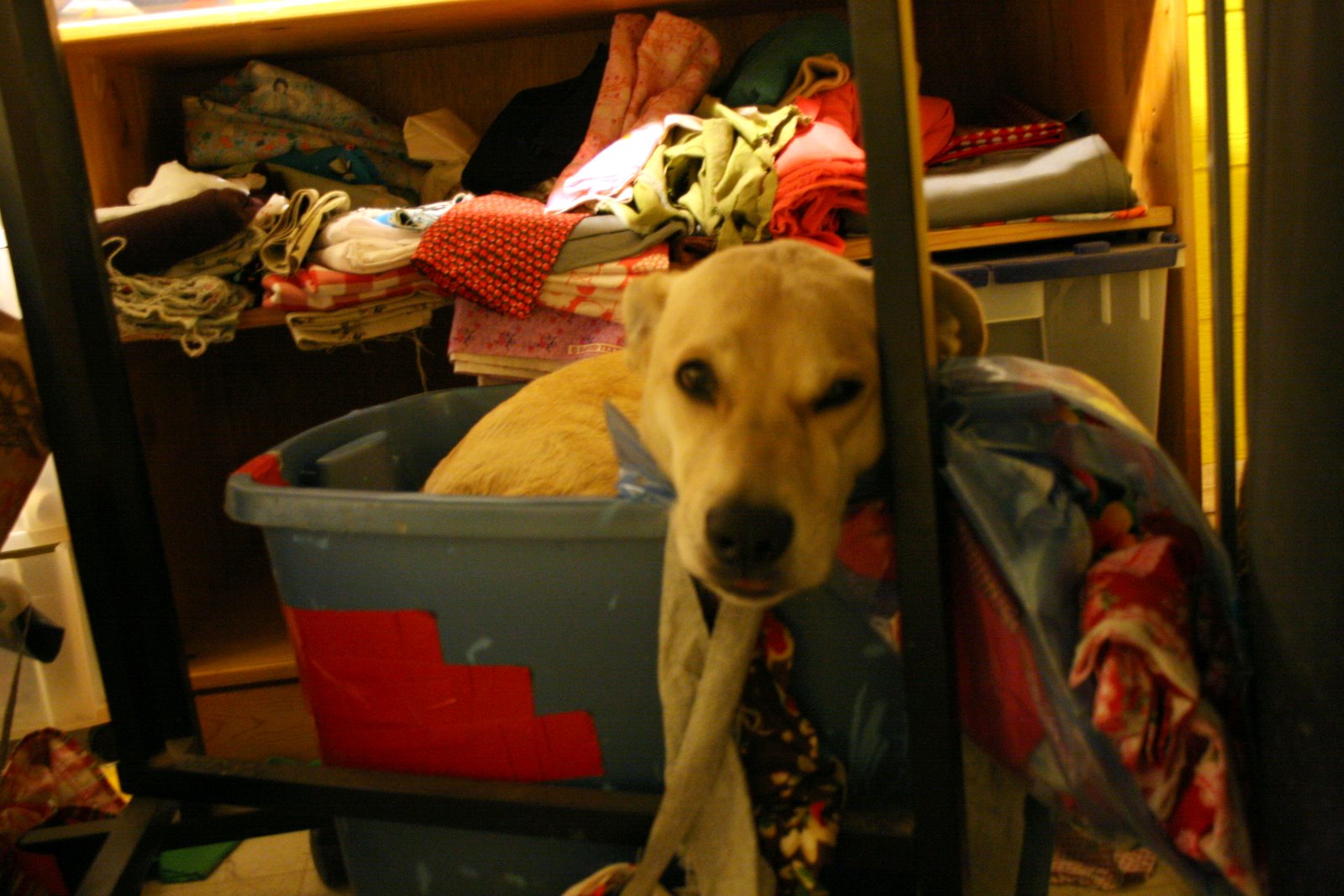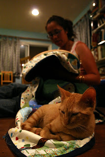 the poor thing only gets the teeniest edge of the quilt for a bed. |