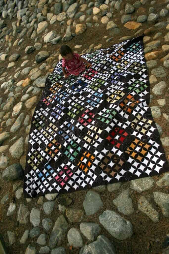 One must always have an assistant for larger jobs. Here’s Leonora inspecting the newly finished Cathedral Windows quilt.